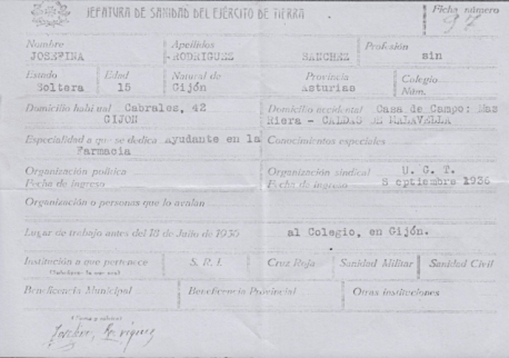 Pépita résidait bien à Gijón (Asturies) au n° 42 de la rue Cabrales et qu’elle avait intégré l’UGT en septembre 1936 (donc à 13 ans !) Le plus important étant dans ce document qu’elle était collégienne et âgée de 15 ans en 1938 ce qui situerait sa date de naissance bien en 1923 et qu’elle avait à peine 18 ans en 1940.